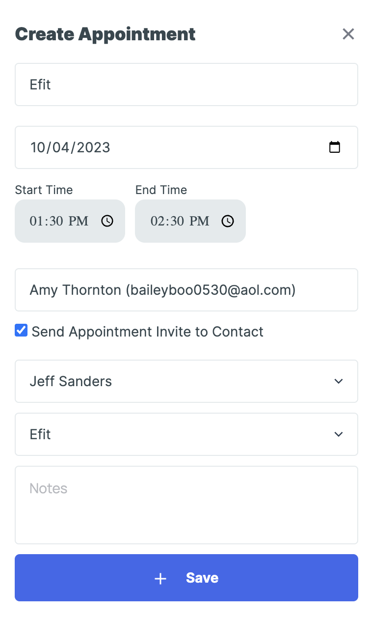 Click on the green + button on the top right to open the below screen. Enter the title, date, start and end time, contact, team member responsible, appointmemt type, and any notes, then click '+ Save.'