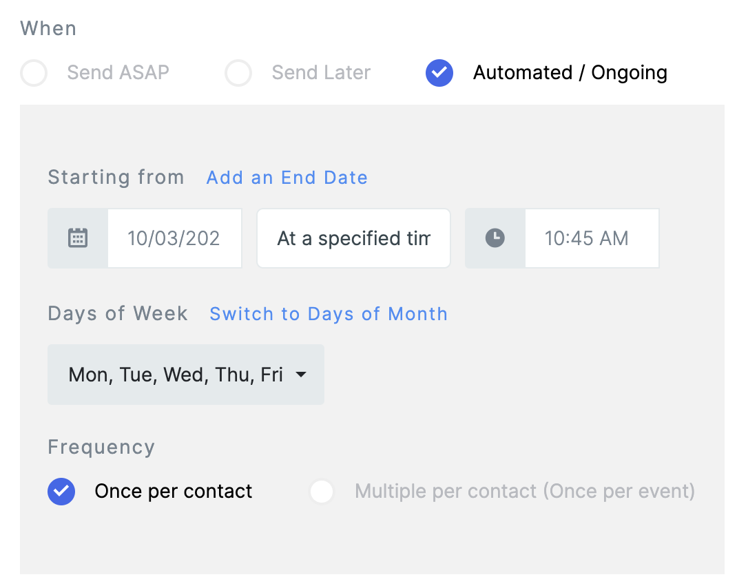 When selecting an 'Automated / Ongoing' campaign' you have 2 options: at a specified time or at any time.
