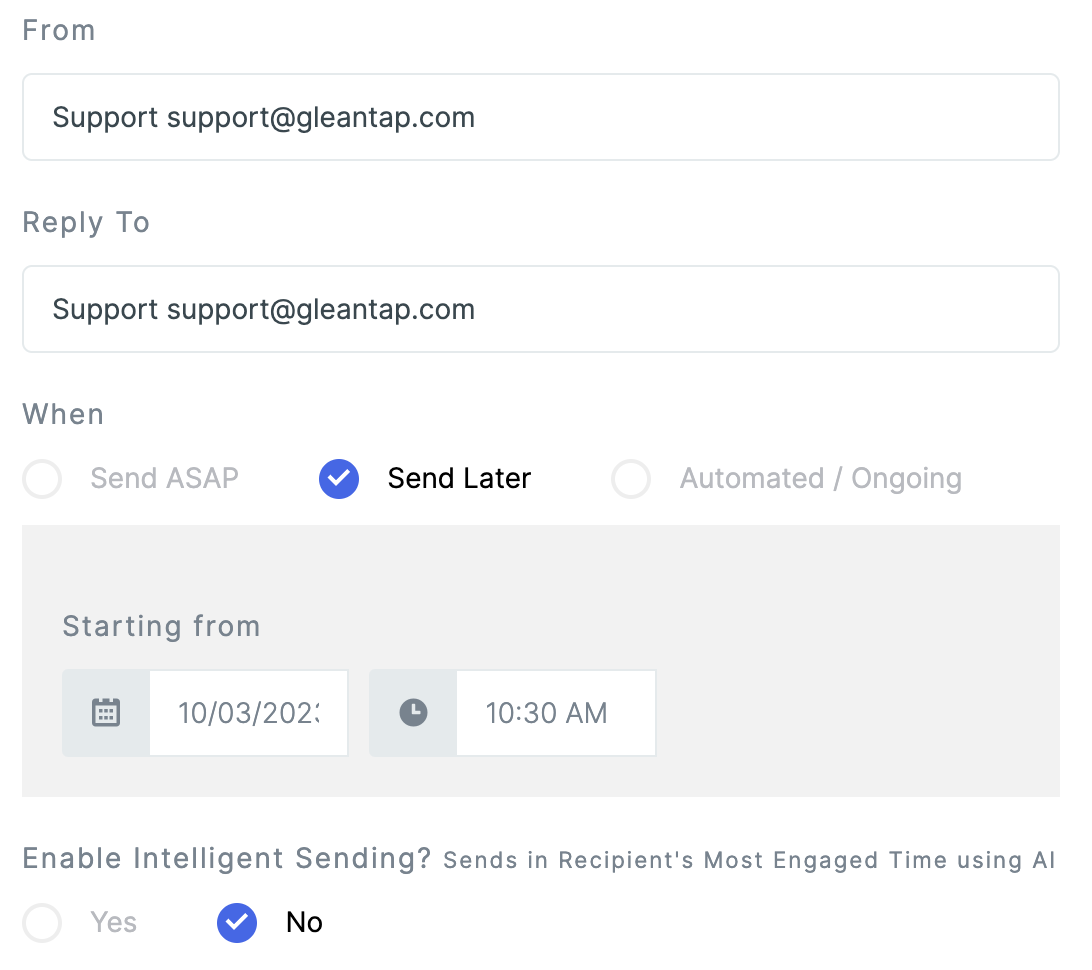 5b: Send Later: If selected, the campaign will begin sending at the time specified.