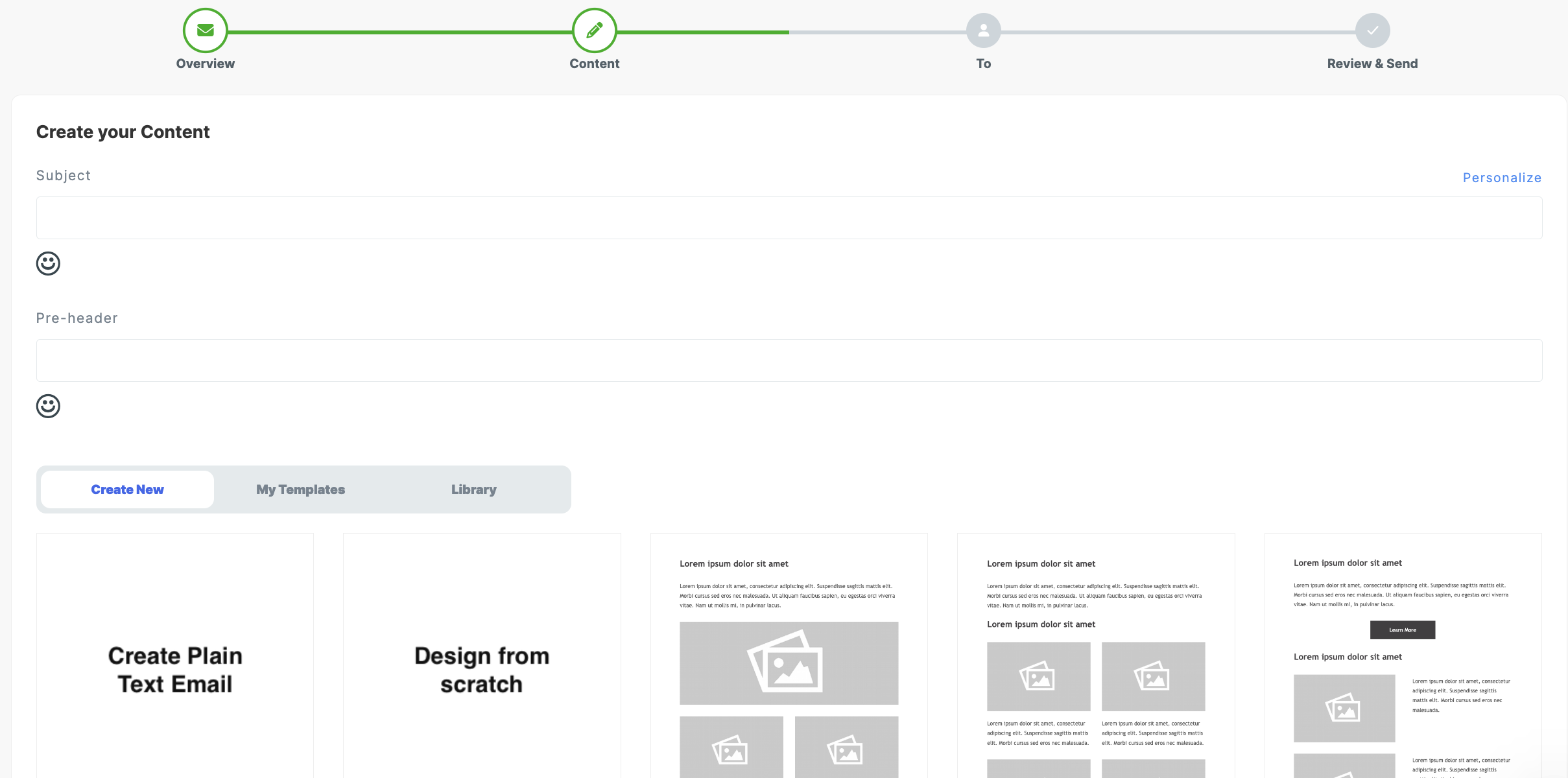 Step 3: Content - Add add content, such as the Subject line, Pre-header text, and whether you'd like to choose an existing template, create a plain text email or if you'd like to design from scratch.