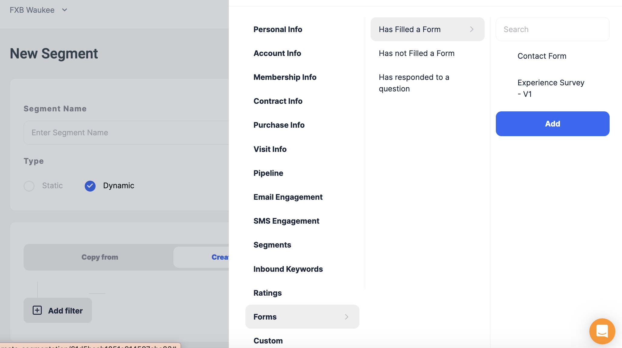 Click on the green '+' button to start a new segment. Then, select 'Add Filter' and click on 'Forms' to see your options.