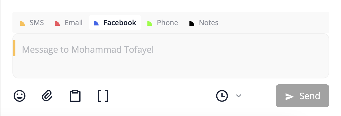 Once the integration has been set up, you will see 'Facebook' as an option in your Inbox message box.&#x20;